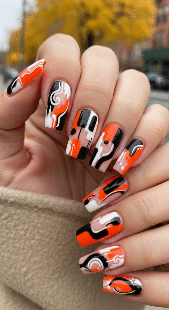 Abstract designs bring creativity to the forefront of fall nails. Swirls, splashes, or geometric shapes in orange make your manicure unique. Combine orange with white, black, or nude tones for contrast. The abstract style gives freedom to experiment with bold or subtle designs. It’s modern, artsy, and eye-catching. A true reflection of New York-inspired fall street style.