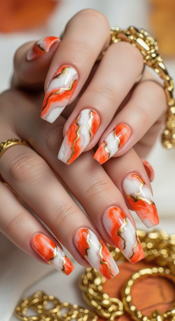 Marble nails are elegant and artistic, and orange takes them to the next level. Blend shades of orange with white and gold for a marbled effect. This design looks luxurious and unique, almost like artwork. It’s perfect for special events or when you want your nails to be the center of attention. Marble nails make everyday glam look high-end.