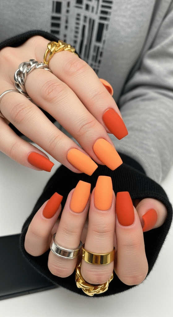Matte finishes bring a modern and trendy twist to orange nails. They create a soft yet bold statement that feels effortlessly chic. Whether you choose bright orange or muted tones, matte texture elevates the design. This look works especially well with square or almond nail shapes. Pair with chunky rings to enhance the urban vibe. It’s sleek, understated, and fashion-forward.