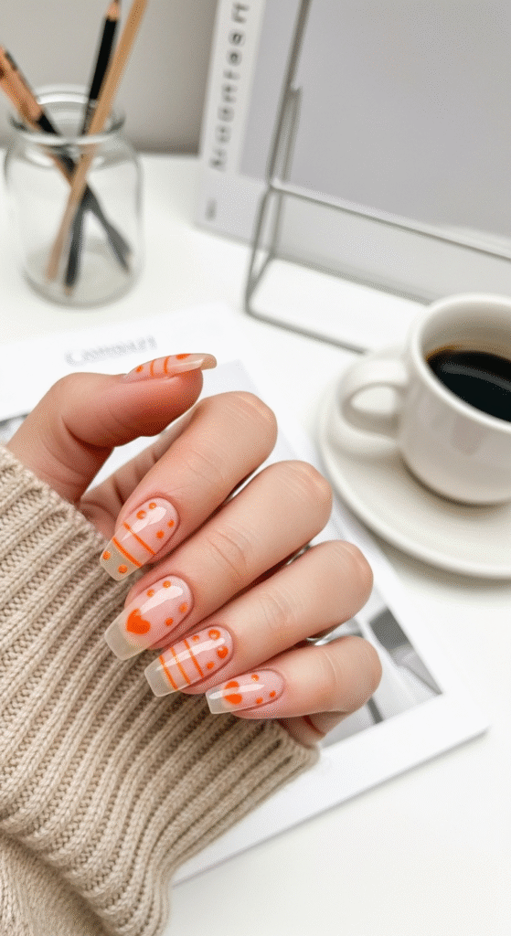 Sometimes less is more, and minimalist accents prove it. A nude or clear base with tiny orange dots, stripes, or hearts looks fresh and chic. Minimalist designs are subtle yet stylish, ideal for everyday wear. They’re also low-maintenance while still trendy. Add a glossy top coat for polish. It’s understated elegance for those who love simplicity.