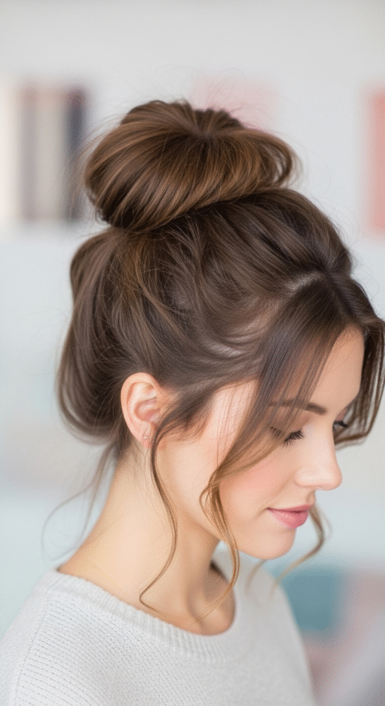 The low messy bun is versatile and practical. It sits neatly at the nape of the neck while still giving a relaxed vibe. You can pull out a few strands near the face to soften the look.