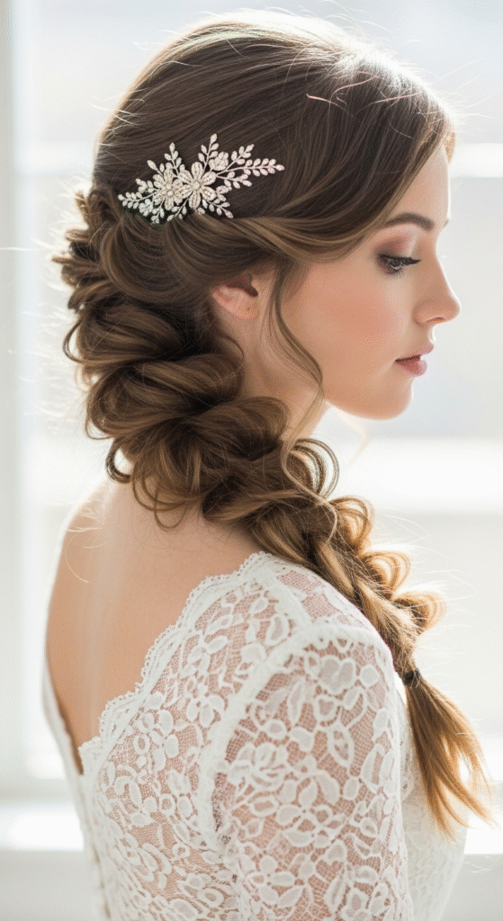 It is especially beautiful with wavy hair and makes you feel like a princess. Small accessories like pearl pins or dainty flowers enhance this regal hairstyle.
